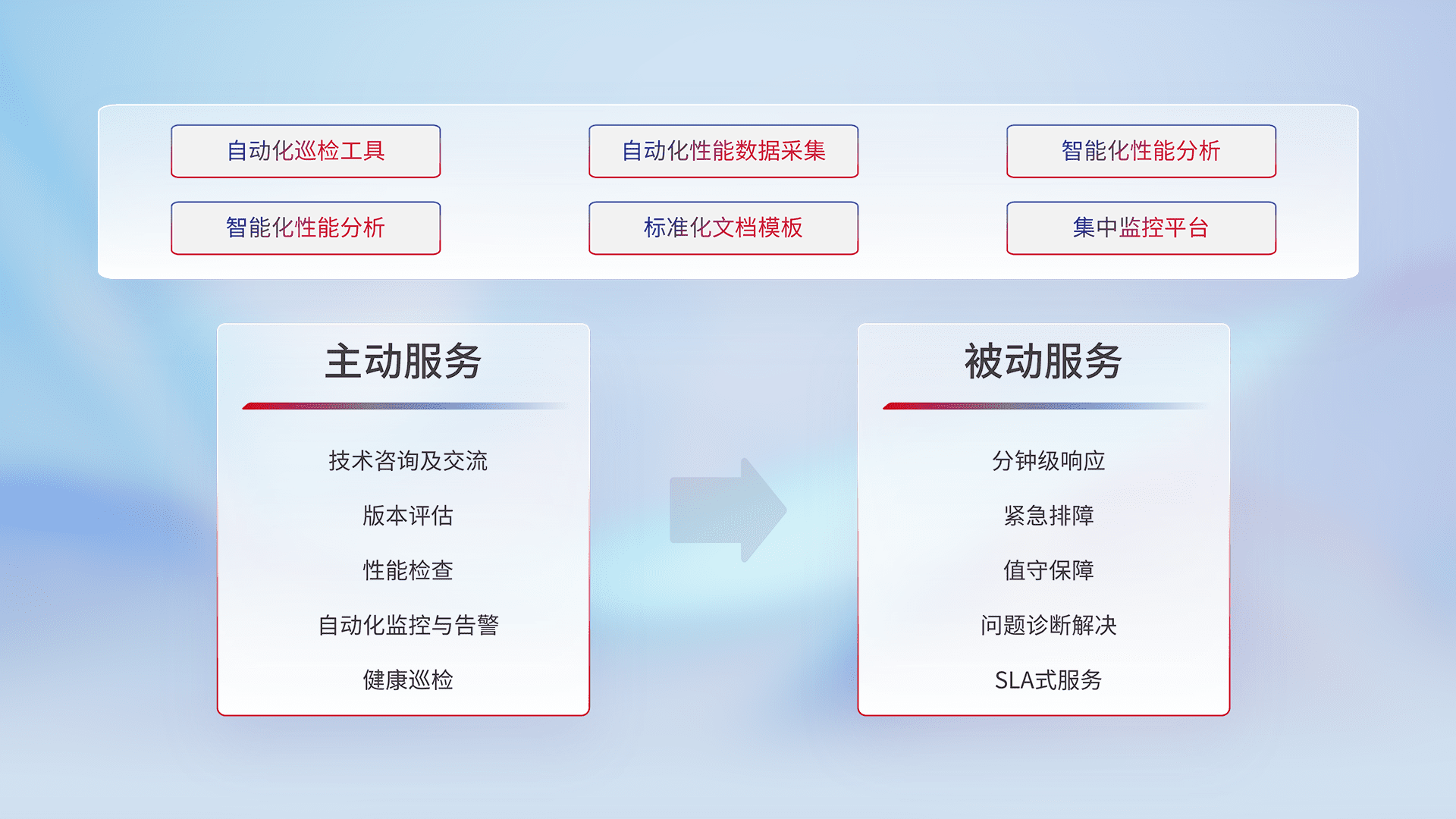 智能化工具和标准化文档,,保障服务质量,,,提供主动服务(包含技术咨询、、版本评估、、性能检查、、、自动化监控与告警、、、健康巡检)和被动服务包含(分钟级响应、、、、紧急排障、、值守保障、、、问题诊断解决、、、SLA服务)。。